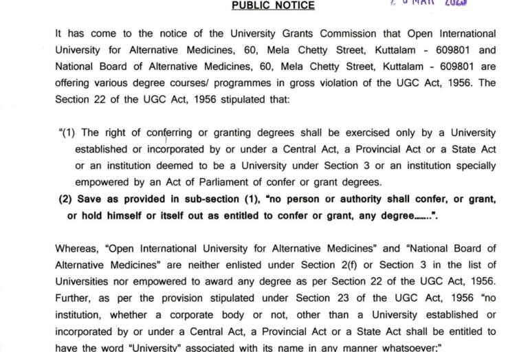 UGC Issues Public Warning Against Fake Institutions: Open International University for Alternative Medicines and National Board of Alternative Medicines